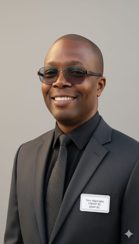 Dr. Tony Akpengbe (DNP, PMHNP-BC, AGNP-BC) specializes in psychiatric mental health and adult-gerontology care